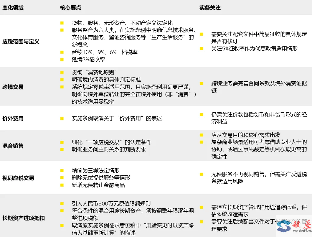 为便于一直紧密关注《增值税法》和《实施条例》动态的读者进一步了解核心内容,我们将《增值税法》及《实施条例》的主要变化,包括对比《实施条例》(征求意见稿)》(以下简称“《征求意见稿》”)的重大变化条款),以及实务关注角度归纳如下:
