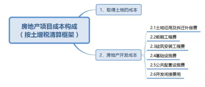 首先,我们按照土地增值税清算的框架,房地产项目的成本主要由取得土地的成本和房地产开发成本两大部分组成,如下图: