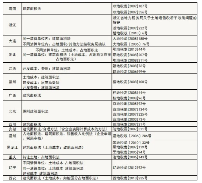 基于以上几点,我们对土地增值税清算中央及各地的成本分摊方法的相关税收政策梳理汇总如下